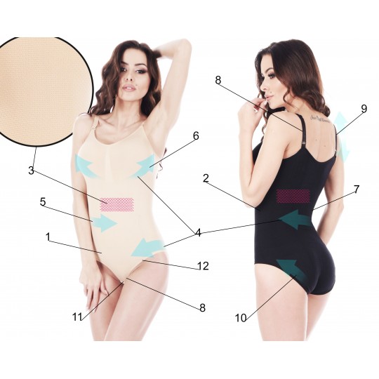 8) Regulacja stanu body - ramiączka o regulowanej długości w połączeniu z trzystopniową regulacją zapięcia w kroku pozwalają na optymalne dopasowanie wysokości stanu body wyszczuplającego do konkretnej sylwetki.