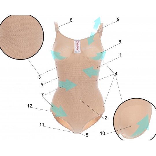 7) Body MASSAGE siut marki Orirose wizualnie MODELUJE SYLWETKĘ nadając jej kobiece proporcje, poprzez wizualne wyokrąglenie biustu, przy jednoczesnym wyszczupleniu/wygładzeniu linii talii, brzucha i bioder. Body kształtuje na nowo figurę na odcinku od linii pośladków, poprzez biodra, dolne i górne partie brzucha, linię talii po biust