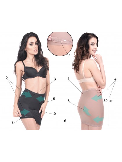 2) Spódnica wyszczuplająca w szybki i dyskretny sposób skoryguje (ukształtuje na nowo) figurę na odcinku od wcięcia w talii poprzez środkowe i dolne partie brzucha, poprzez linię bioder i pośladków po uda.