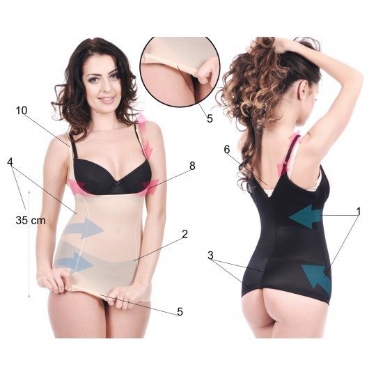 2) Unikalny krój w połączeniu z zaletami tkaniny unosi biust, wygładza talię, wyszczupla dolne i górne partie brzucha oraz modeluje linię bioder przy zachowaniu komfortu i dyskrecji użytkowania.