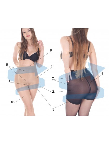 2) Część majtkowa - gorsetowa wyszczupla i modeluje talię, dolne i górne partie brzucha, kształtuje i wygładza linię bioder i ud oraz ujędrnia i wygładza pośladki.