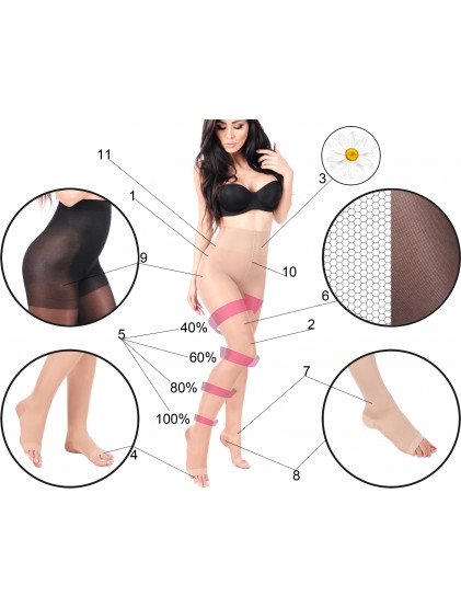 5) Stopniowany ucisk ujędrnia i wygładza nogi na całej długości. Ucisk odpowiednio na wysokości kostki najsilniejszy i stopniowo słabnący na wysokości łydki, ud i bioder,  - stymulowanie krążenia (poprawienie odpływu krwi z kończyny dolnej do serca). Rajstopy zapewniają poczucie komfortu, nogi "nie męczą" się i nie puchną.